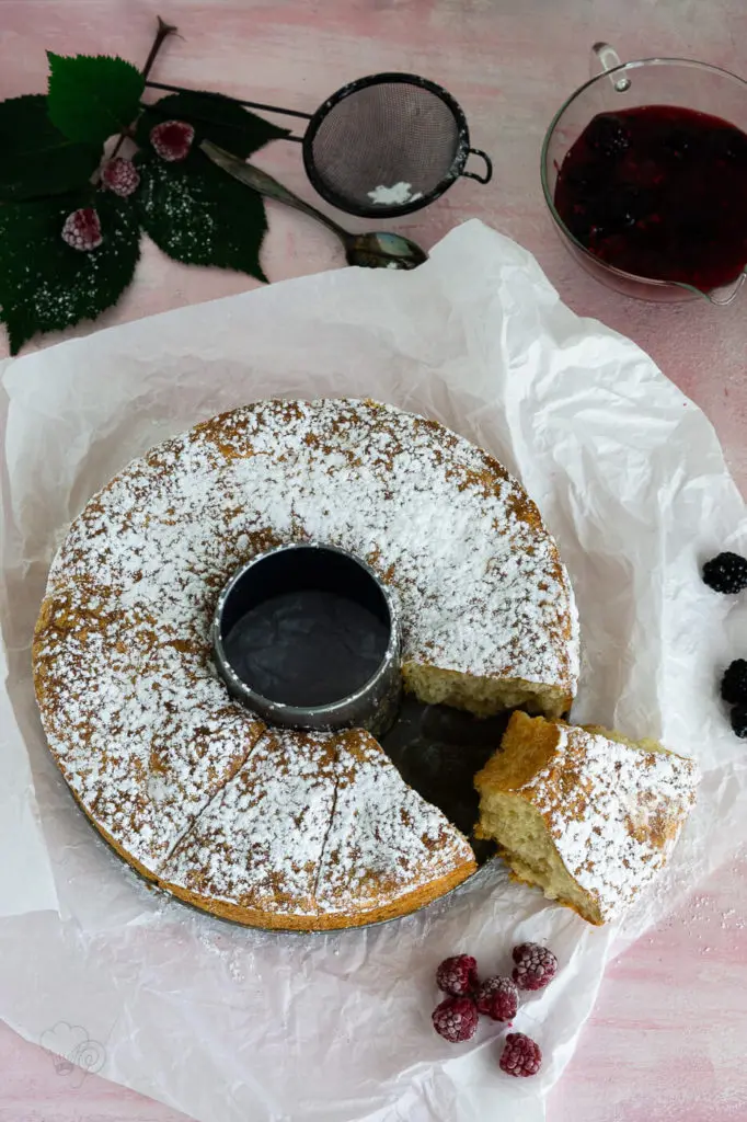 Aus dem Ofen nehmen, kurz abkühlen lassen, dann den Rand der Form entfernen. Mit Puderzucker bestäuben.