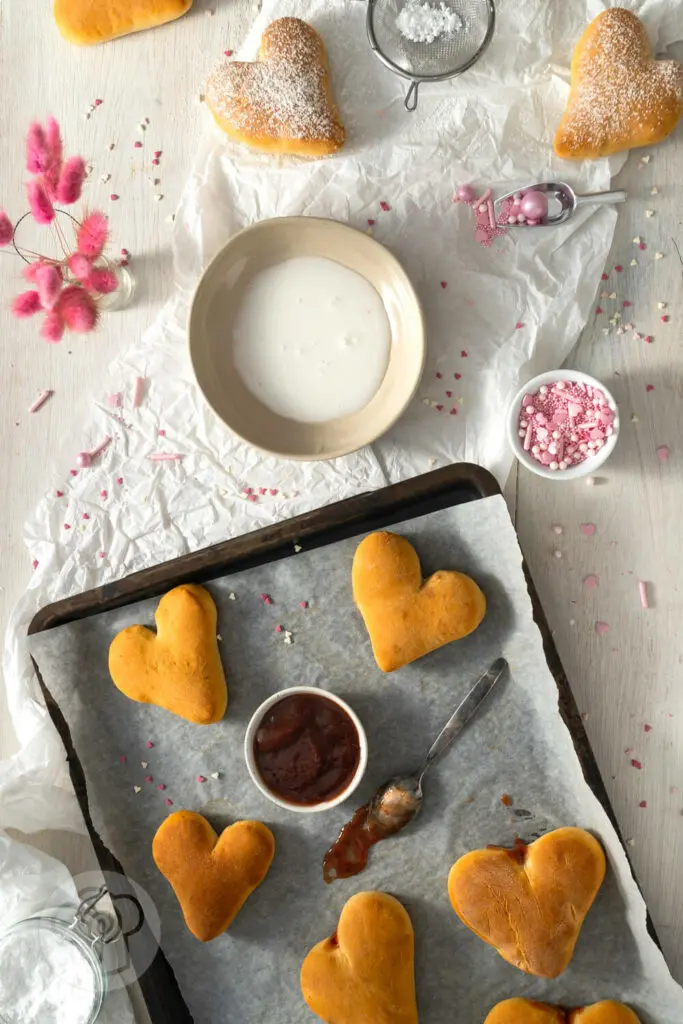 Fluffige Krapfen aus dem Ofen. Die Herzform passt toll zu Valentinstag oder Muttertag.