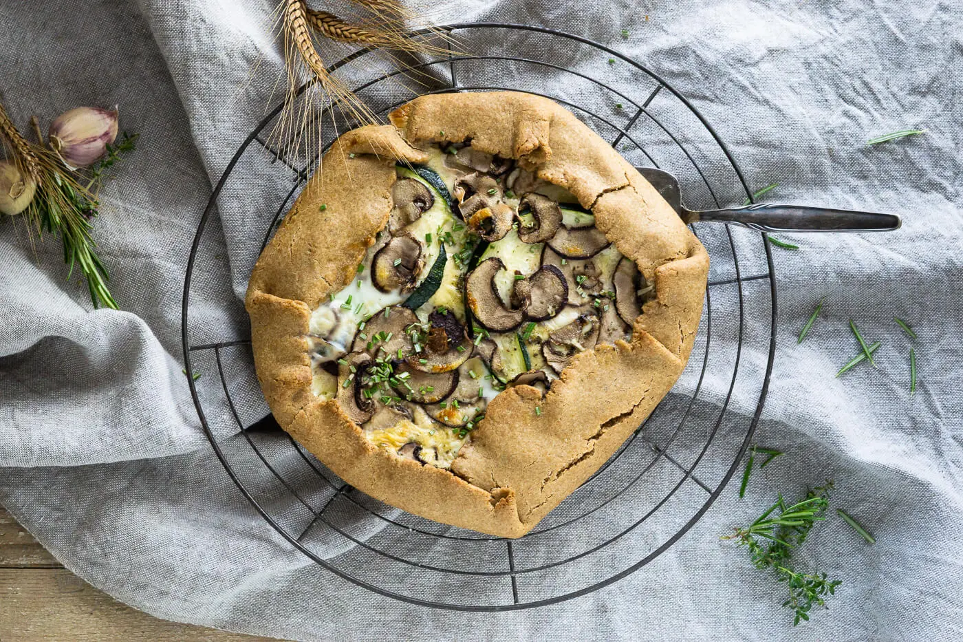 Den Teig halbieren und zwei ca. 2 mm dicke runde Fladen ausrollen. Mit Zucchini und Pilzen belegen, dabei einen Rand von ca. 3 cm ringsum lassen.